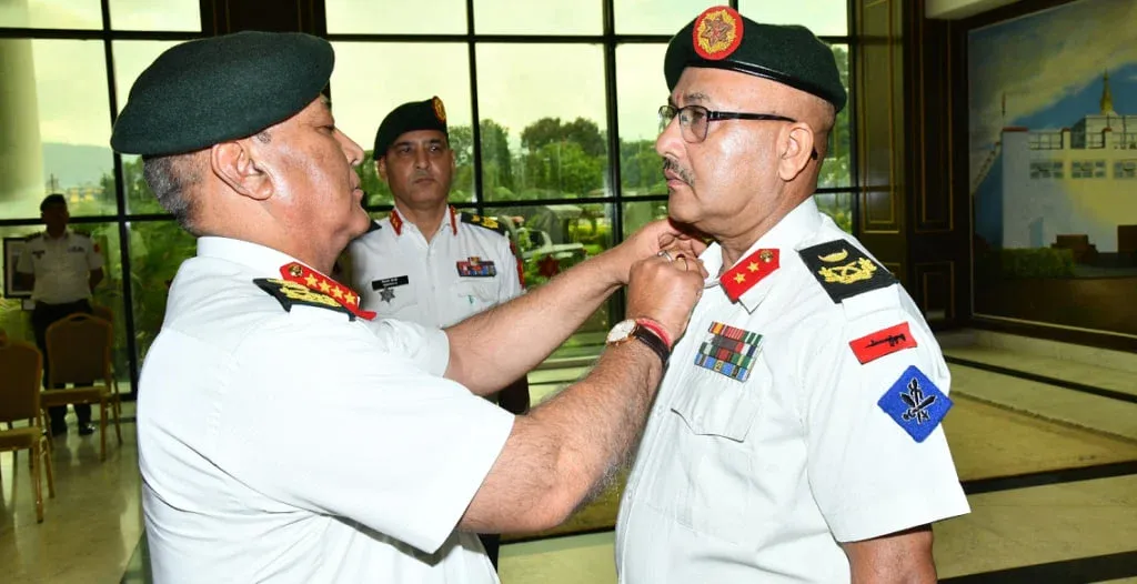 काठमाडौं । नेपाली सेनाको उपरथीमा बढुवा भएका गौरवकुमार केसीलाई दर्ज्यानी चिन्ह प्रदान गरिएको छ । आज (शुक्रबार) प्रधानसेनापति अशोकराज सिग्देलले जंगी अड्डामा केसीलाई उपरथीको दर्ज्यानी चिन्ह प्रदान गरेका हुन् ।
