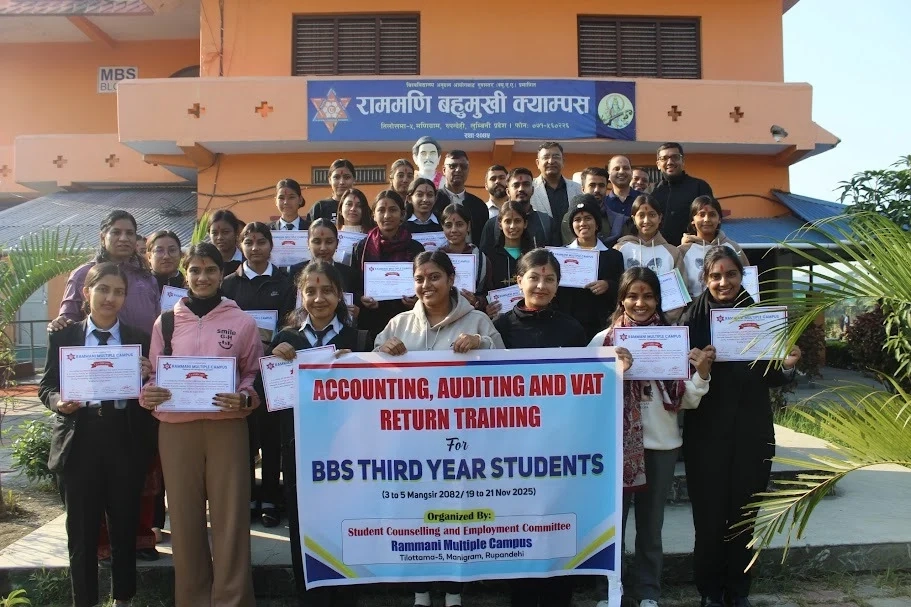 मणिग्राम, मंसीर ५ । रूपन्देहीको मणिग्रामस्थित राममणि बहुमुखी क्याम्पसमा तीन बेग्लाबेग्लै प्रशिक्षण सम्पन्न भएका छन् । क्याम्पसमा सञ्चालित लेखा, कर प्रणाली तथा मूल्य अभिवृद्धि कर दाखिला सम्बन्धी तीन दिने प्रशिक्षण आज (शुक्रबार) सम्पन्न भयो । तालिममा चार्टर्ड अकाउण्टेण्टहरूः प्रमोद पन्थी, नवराज अर्याल र सन्तोष पन्थले तालिम दिनुभएको थियो ।