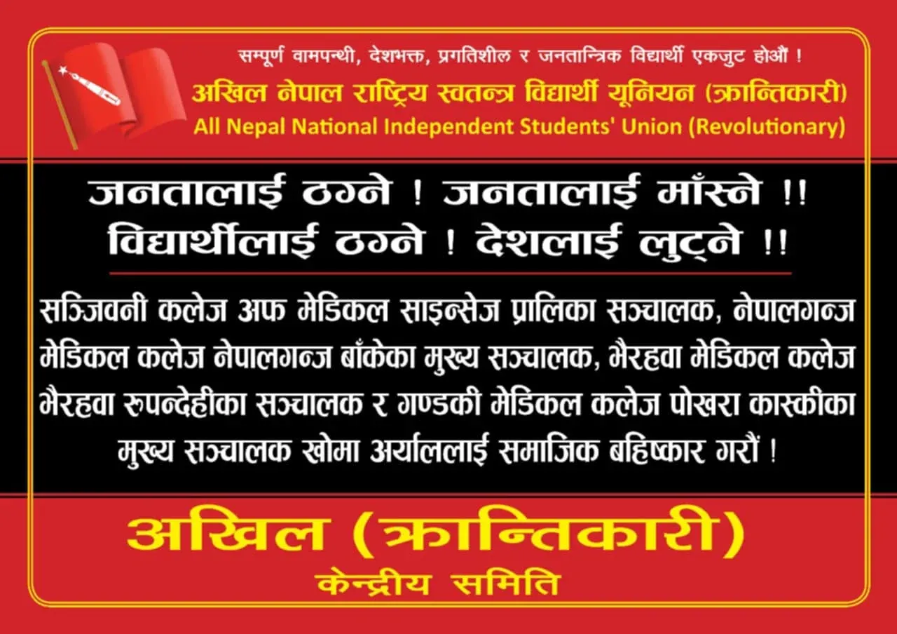 विद्यार्थीलाई ठग्ने ! देशलाई लुट्ने ! भन्दै खाेमा अर्याललाई गरियाे सामाजिक बहिष्कार