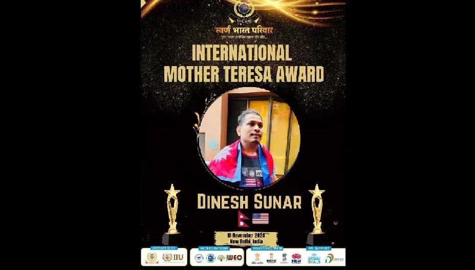 पार्कर खेलाडी दिनेशलाई यस वर्षको अन्तर्राष्ट्रिय मदर टेरेसा पुरस्कार प्रदान