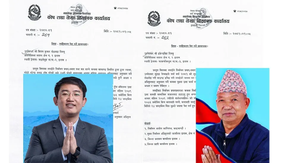 इलाम–२ उपनिर्वाचनका उम्मेदवार मिलन र डकेन्द्रलाई लेखा कार्यालयको स्पष्टीकरण सोध्यो