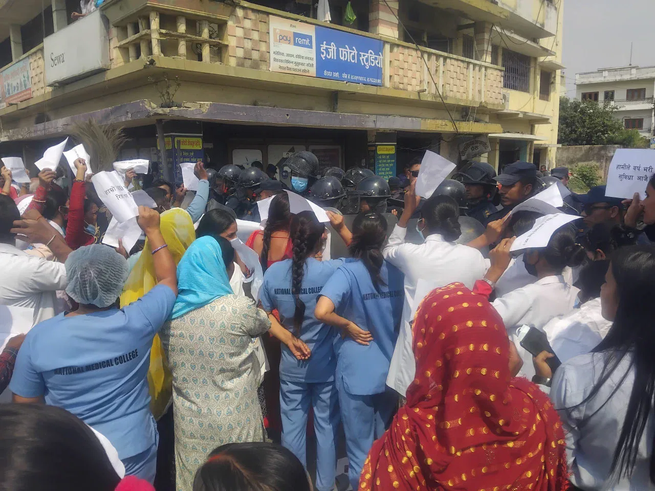 नेशनल मेडिकल कलेजका एमडी र ल्याब इन्चार्जलाई रिहा गर्न माग गर्दै वीरगञ्जमा प्रदर्शन