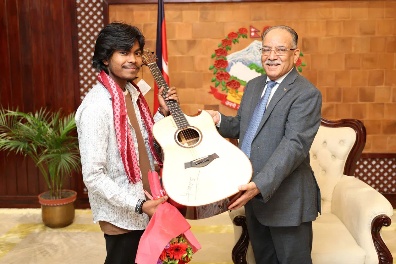 नेपाल आइडलका विजेता करण परियारलाई प्रधानमन्त्रीले दिए गितार उपहार
