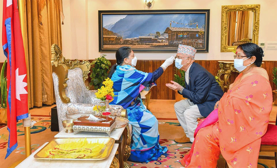 राष्ट्रपतिको हातबाट लगाए प्रधानमन्त्री ओलीले दसैँको टीका