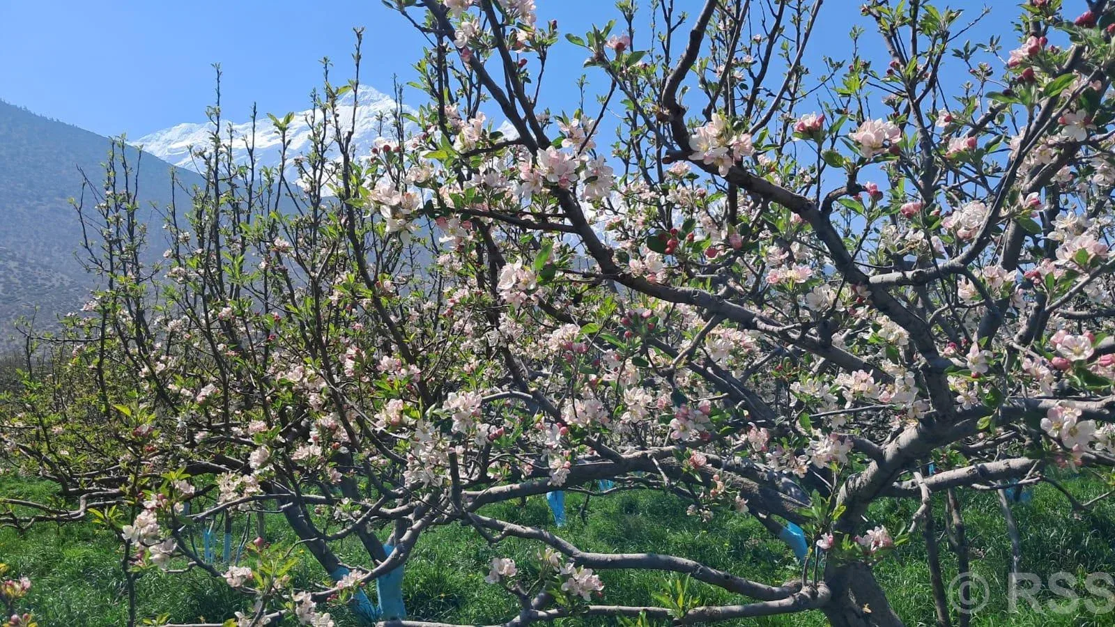 स्याउको राजधानी मुस्ताङ : बगैँचाभित्रको स्याउका बोटहरु फूलेर सेताम्मे