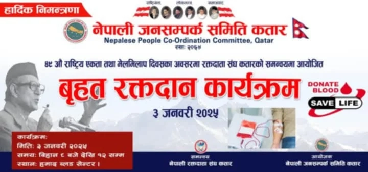 नेपाली जनसम्पर्क समिती कतारले अगामी जनवरी ३ तारीखमा रक्तदान गर्दै