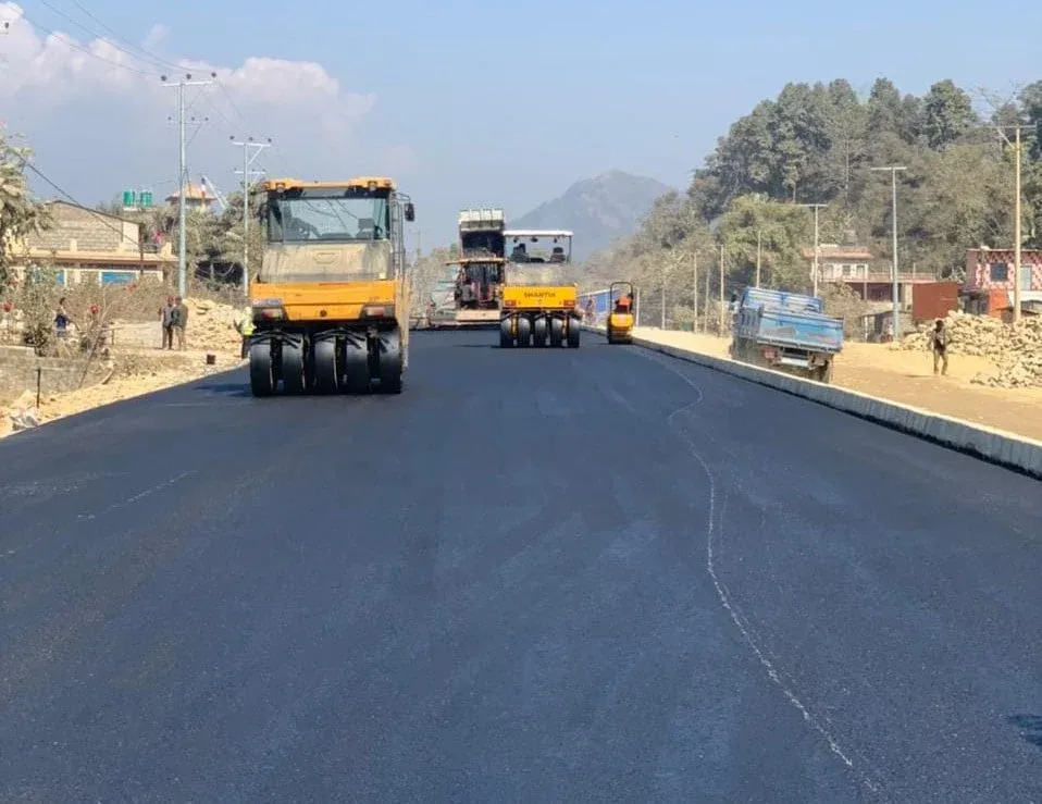 मुग्लिन-पोखरा सडकः दमौली बजारमा धमाधम कालोपत्र हुँदै